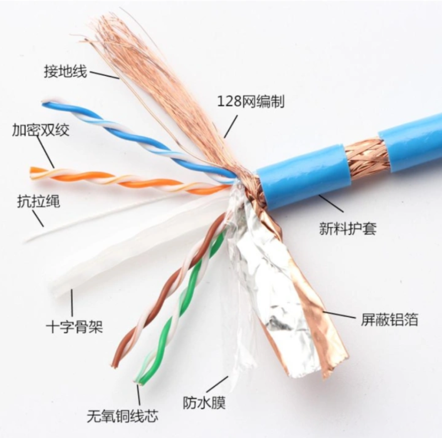 S/FTP. Արտաքին պղնձե մետաղալարով հյուսված պաշտպանություն, զույգ-զույգ ալյումինե փայլաթիթեղի պաշտպանություն, լավ պաշտպանիչ էֆեկտ, CAT6A և ավելի բարձր կօգտագործեն այս կառուցվածքը: