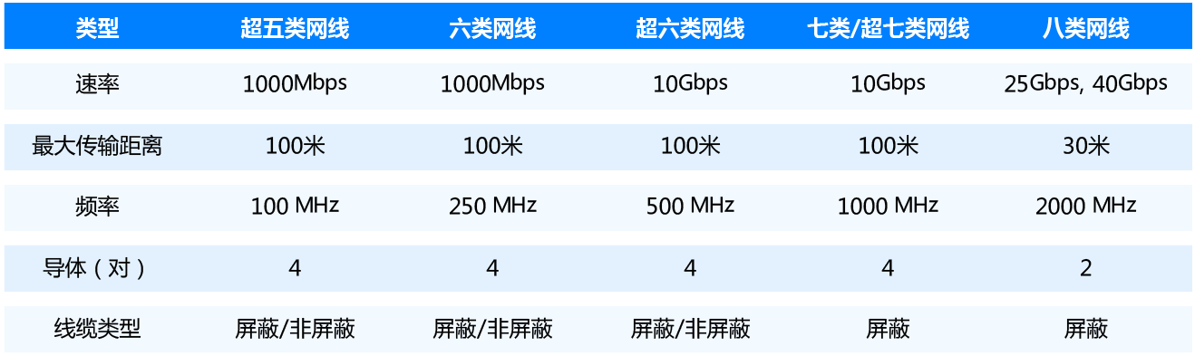 Սովորաբար օգտագործվող ցանցային մալուխները կարելի է բաժանելCAT5E(սուպեր հինգ կատեգորիաներ), CAT6 (վեց կատեգորիաներ), CAT6A (սուպեր վեց կատեգորիաներ), CAT7 (յոթ կատեգորիաներ), CAT7A (սուպեր յոթ կատեգորիաներ), CAT8 (ութ կատեգորիաներ), որոնց թվում.