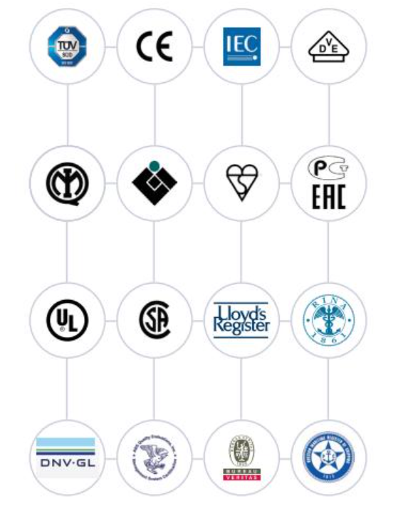 Төменде кейбір кабель өнеркәсібін сертификаттау органдарының логотиптері берілген.Кабельдерді таңдаған кезде сапа мен өнімнің қызмет ету мерзімінің кепілі болып табылатын тиісті салалық сертификаттау белгілері бар өнімдерді іздеңіз.